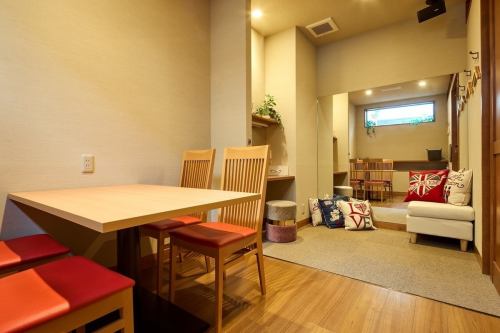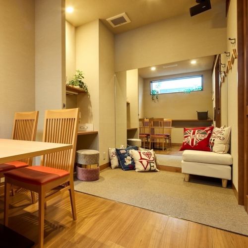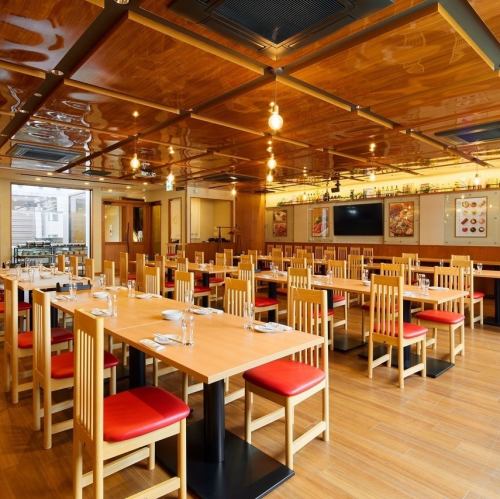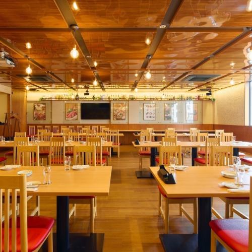間仕切りでお部屋を分けて、20名様からお人数様に合わせて個室のご用意ございます。広々とした落ち着いた空間のテーブル席です。